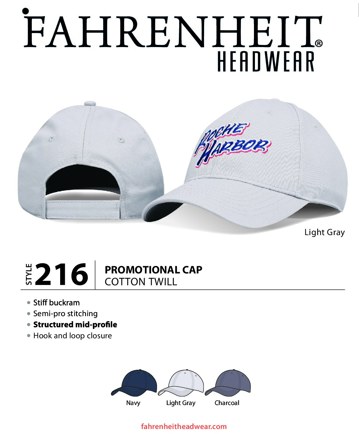 216 COTTON TWILL PROMOTIONAL CAP You must register for a wholesale account to see your price. Stiff buckram Semi-pro stitching Structured mid-profile Closure: Hook & Loop Available in 3 colors