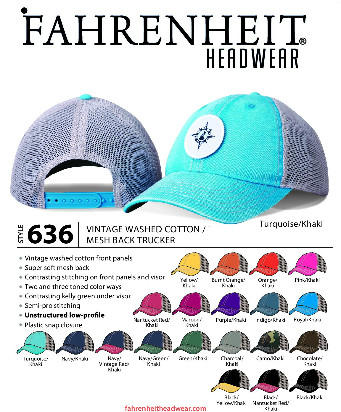 Yellow/KhakiBurnt Orange/KhakiOrange/KhakiPink/KhakiNantucket Red/KhakiMaroon/KhakiPurple/KhakiIndigo/KhakiRoyal/KhakiTurquoise/KhakiNavy/KhakiNavy/Vintage Red/KhakiNavy/Green/KhakiGreen/KhakiCharcoal/KhakiChocolate/KhakiBlack/Yellow/KhakiBlack/Nantucket Red/KhakiBlack/KhakiCaps, Unstructured, Trucker,