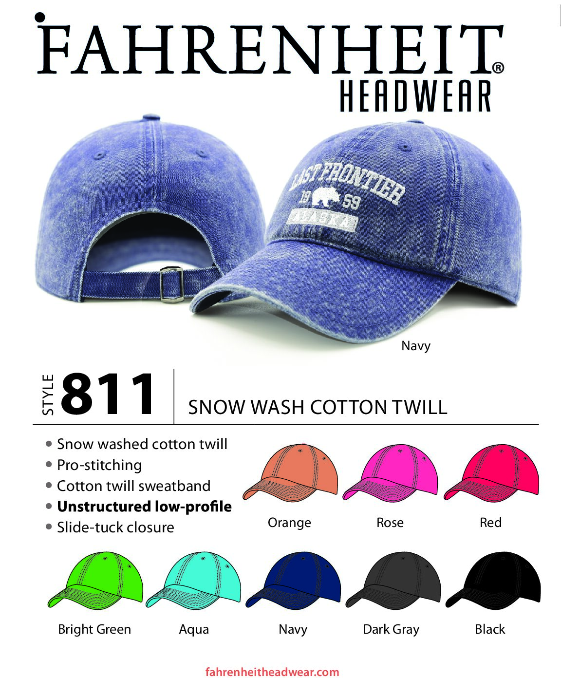 811 SNOW WASHED COTTON TWILL You must register for a wholesale account to see your price. Snow washed cotton twill Pro-stitching Cotton twill sweatband Unstructured low-profile Slide-tuck closure Closure: Slide-Tuck Available in 8 colors